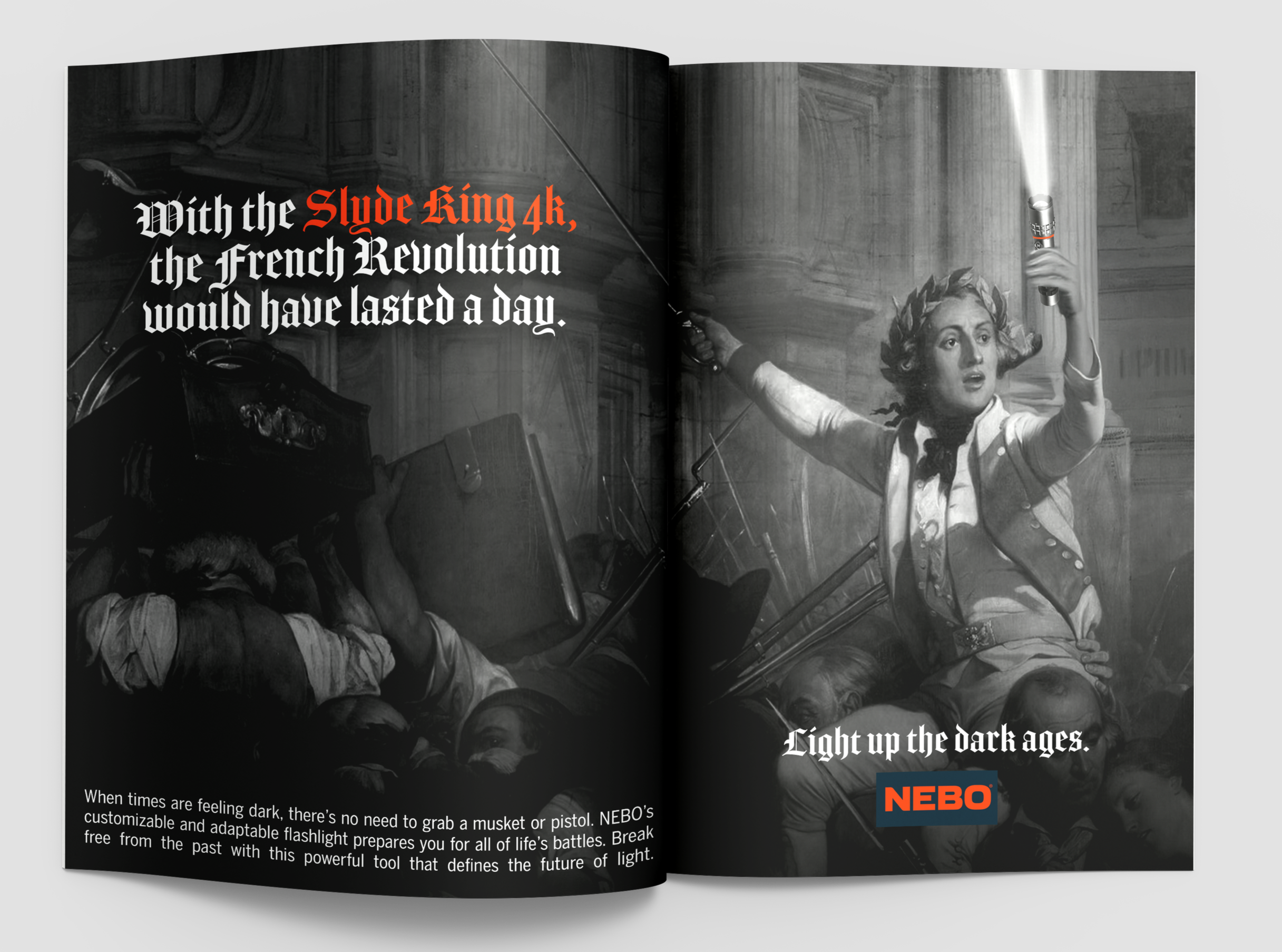 Throughout history, people have struggled through the dark with torches and weak lights. Now drop a NEBO flashlight into the picture. That contrast shows that the need for reliable light has always been there, the technology just hadn’t caught up. By reimagining history with better lighting, this idea shows that NEBO is the kind of flashlight people have always needed, in any era.